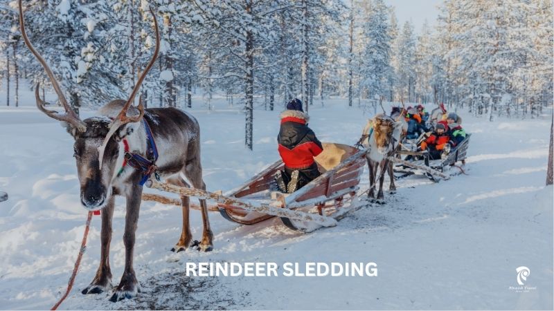 นั่งรถลากเลื่อนกวางเรนเดียร์ ยานพาหนะของซานตาครอส ไปบนลานหิมะ ท่านสามารถให้อาหาร และสัมผัสความน่ารักของกวางเรนเดียร์ได้อย่างใกล้ชิดไปบนพื้นที่เต็มไปด้วยหิมะที่ขาวโพนท่านจะได้สัมผัสพร้อมถ่ายรูปกวางเรนเดียรแห่งขั่วโลกเหนือที่ท่านจะประทับใจ